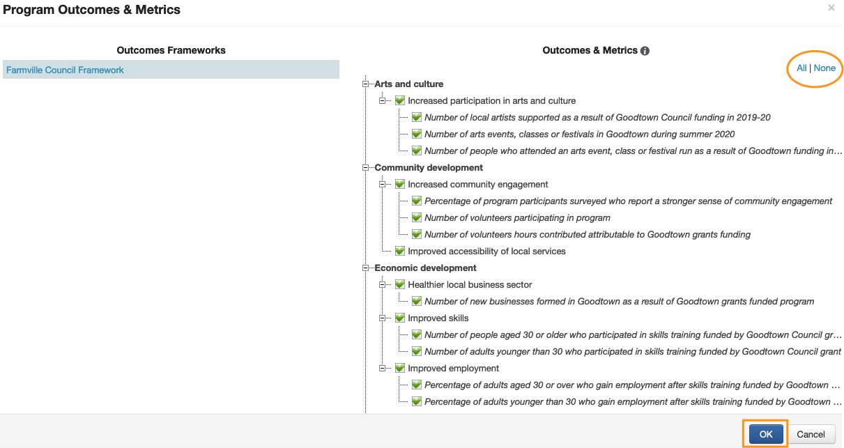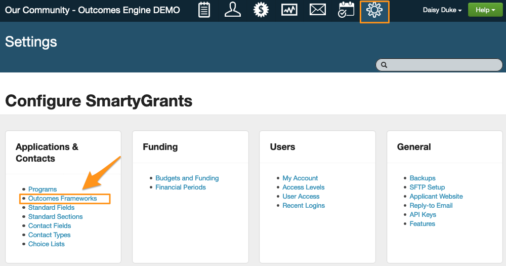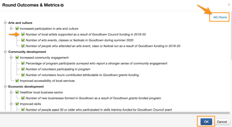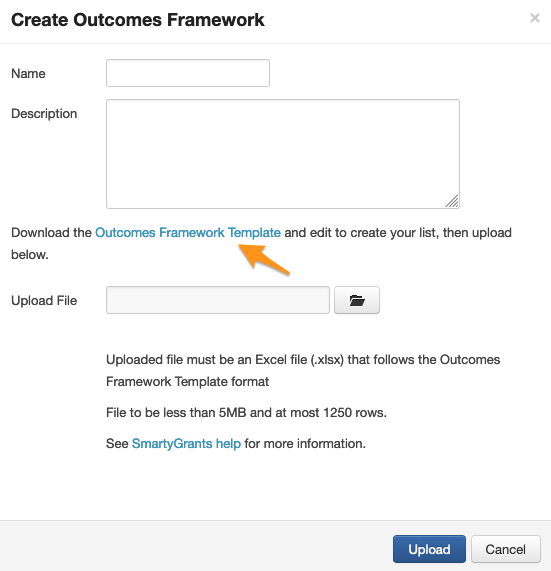 Outcomes Framework: By uploading one or more Outcomes Frameworks into SmartyGrants, you can track outcomes and associated metrics across grant rounds and programs. To get you started see the Example Outcome Frameworks.
