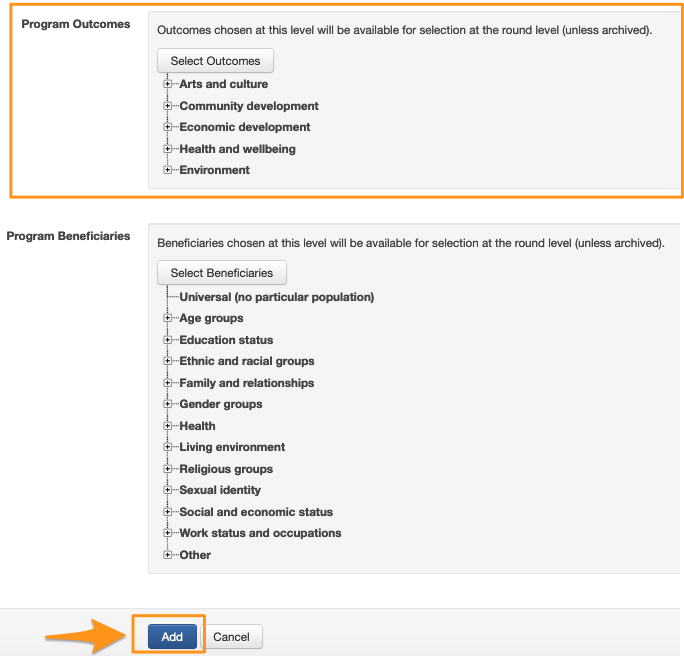 Step-by-step instructions are provided below but essentially you can track outcomes by uploading your Outcomes Framework (using the SmartyGrants template) or multiple frameworks in your account settings area. You can then select from these framework/s which Outcomes and Metrics you would like to track for each Program, and for each Round.