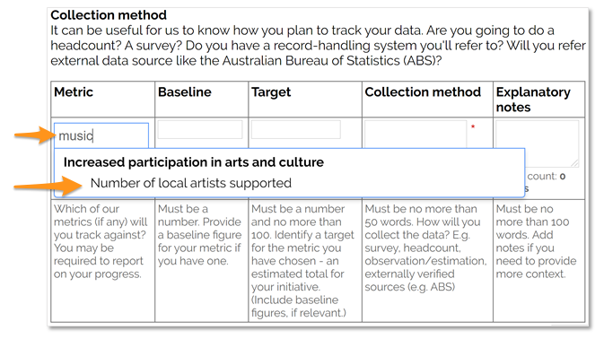 Additional keywords | All words used in Columns A, B and C (other than linking words like ‘the’) will automatically become keywords in SmartyGrants, but Column G of the Outcomes Framework allows you to provide additional keywords or synonyms that may make it easier for users who are filling out the form to find the right term. For example, your Domain, Outcome or Metric might use the word ‘Hearing impaired’ but if you also put the word ‘Deaf’ in the ‘Additional Keywords’ column any user typing ‘Deaf’ to search will be directed to ‘Hearing impaired’. In the example below, ‘Musician’ has been included as a keyword for the Metric ‘Number of local artists supported’. Thus when the person filling in the form types ‘Music’ the corresponding Metric comes up as a suggested selection. You can provide as many additional keywords as you wish. Separate each term with a comma. This field is optional. |