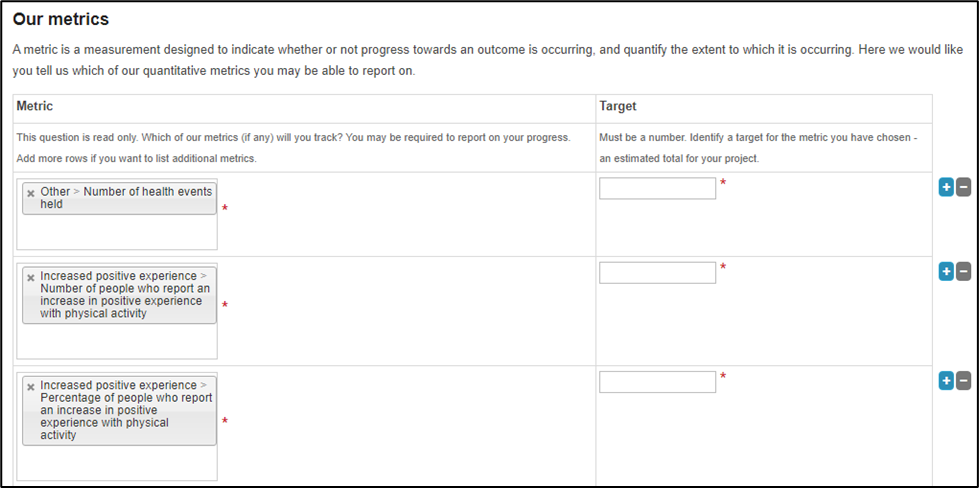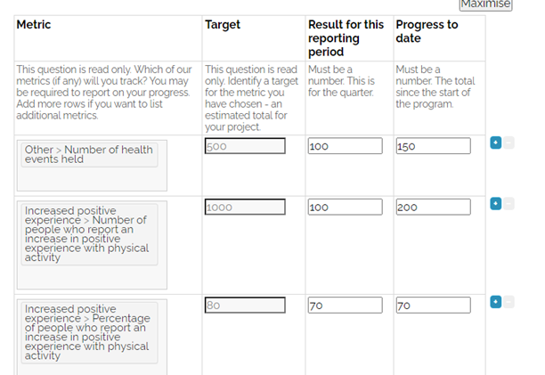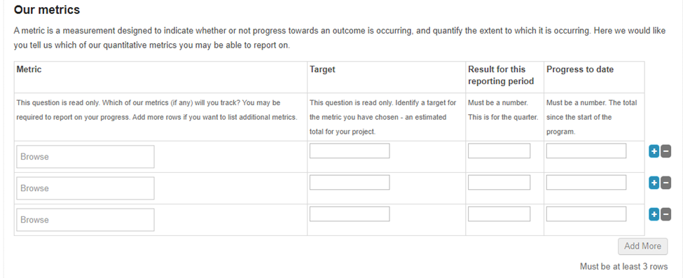 The SmartyGrants Outcome Engine provides a ‘progress’ field for Grantseeker and Grantmaker Metrics. However, the field only appears once i.e. there are no progress 1, progress 2, or progress 3 fields.