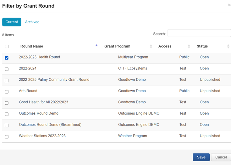 11. In the pop-up box select the round that you want to run the report on (i.e. 2022-2023 Health Round) and hit SAVE
