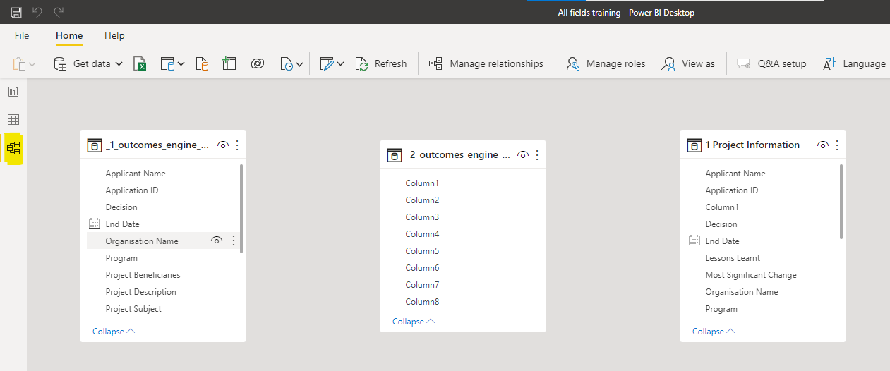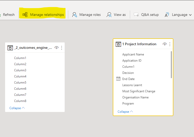 2. Select the Project Information table by clicking on it and then select manage relationships from the top menu.