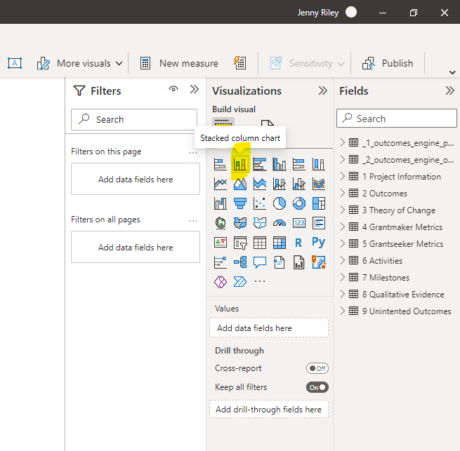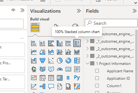 7. Select your first visualisation type from the Visualisation menu on the right by clicking on “Stacked column chart”