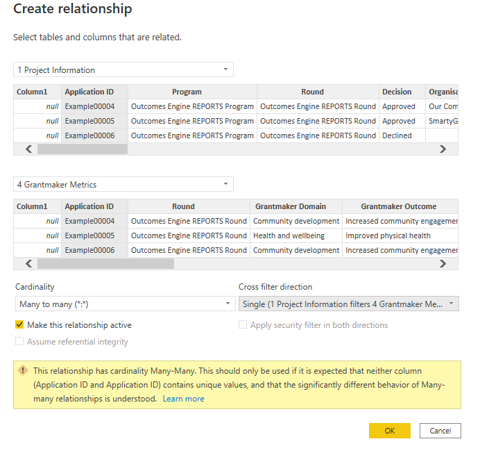 4. In the first drop down menu select Project Information and select the column ApplicationID and in the second drop down select Grantmaker Metrics and highlight ApplicationID. In Cardinality select Many to Many and hit OK.