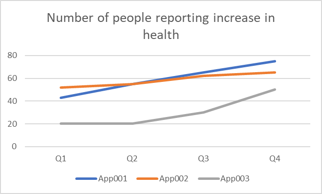 You may require multiple progress reports if the grant goes over 12 months. Collecting multiple data points allows you and the grantee to track progress over time. See the graph below as an example of quarterly reporting of the number of people reporting an increase in health.