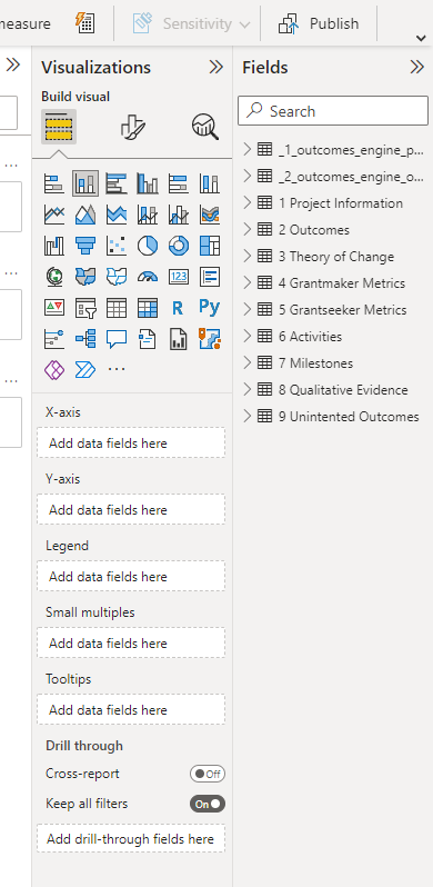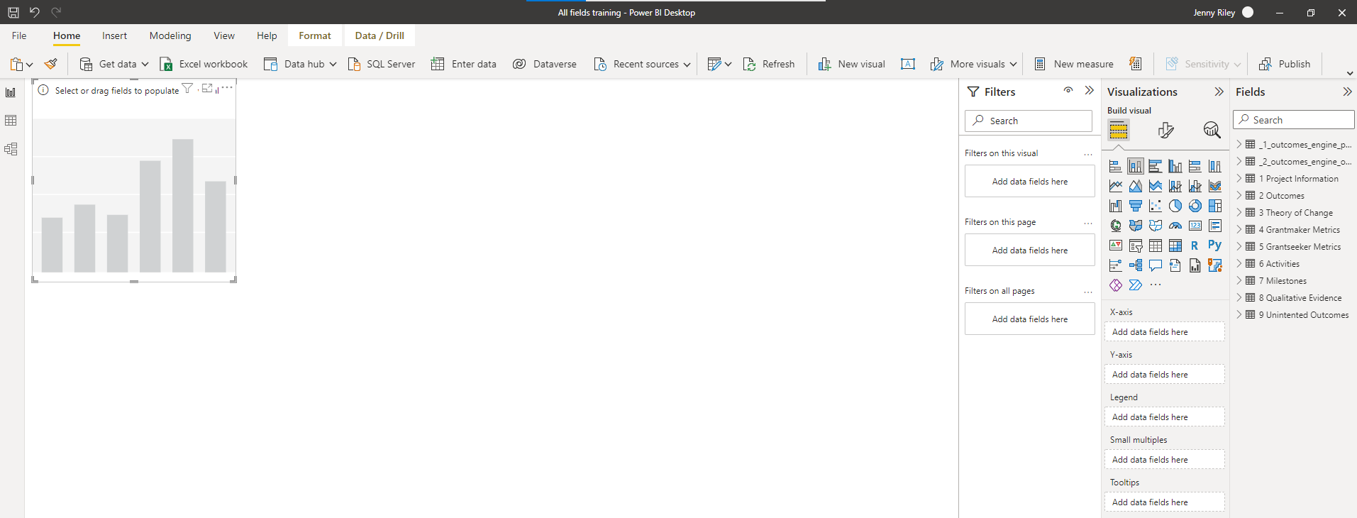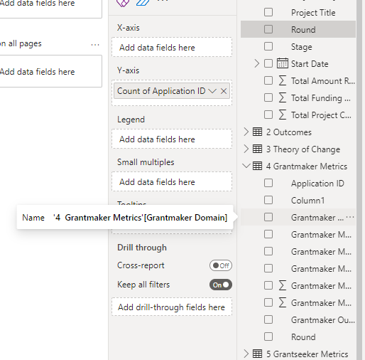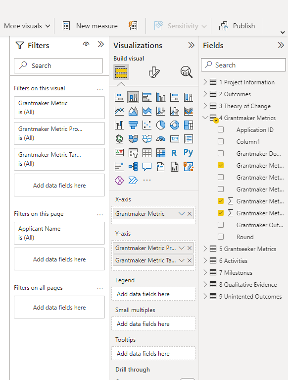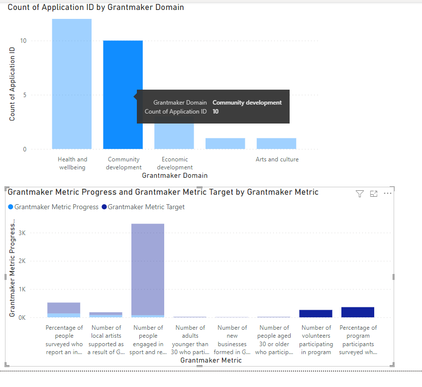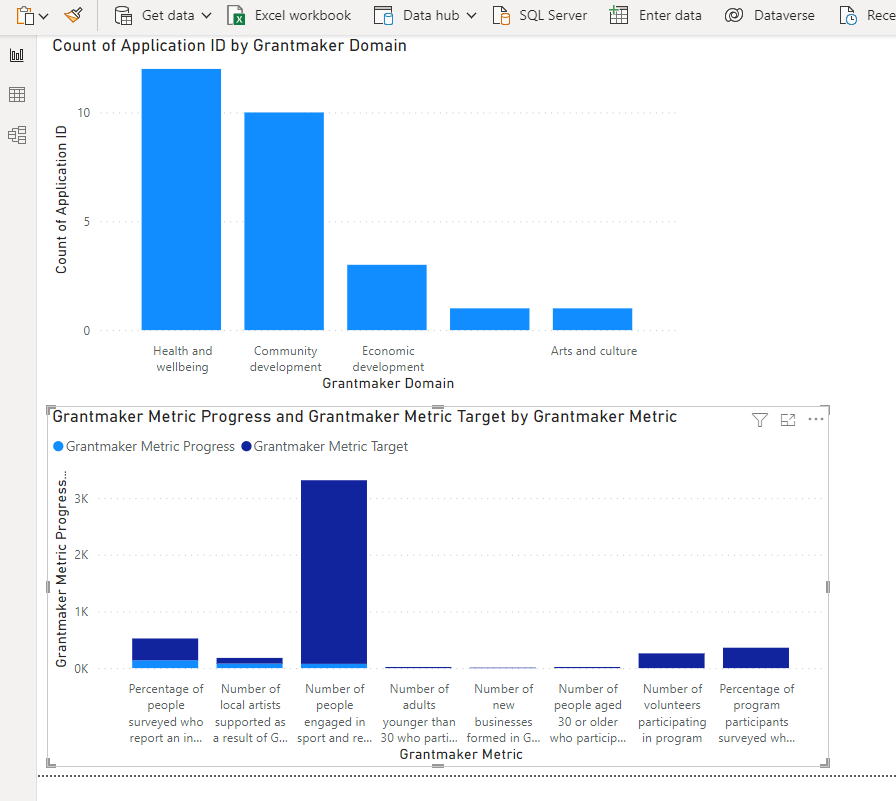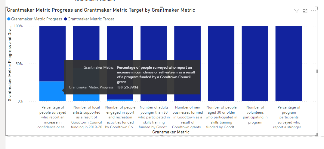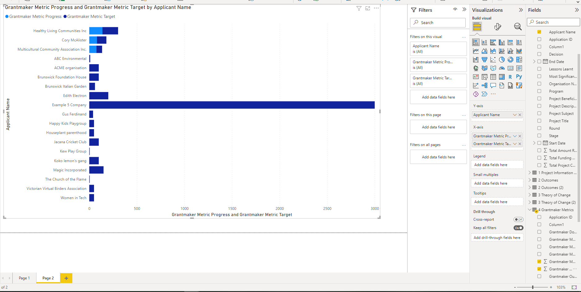 20. Great you say but I want to know which of my grantees is providing the outcomes. On a new page select a stacked bar chart. Drag the Applicant Name (from Project Infomation table) into the Y-Axis and Grantmaker Metric Progress and Grantmaker Metric Target into the X-Axis.