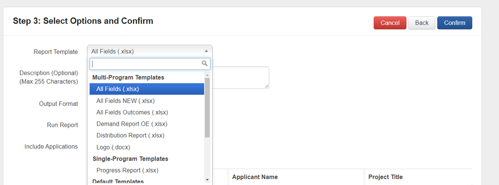 13. In the Report Template drop-down select the All Fields option. Hit confirm.