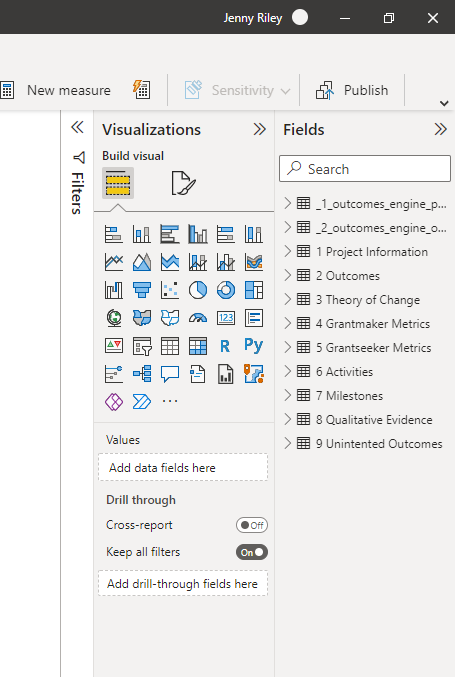 9. To tell PowerBI what you want to see in that visual you use the Build Visual and Fields menus on the right.