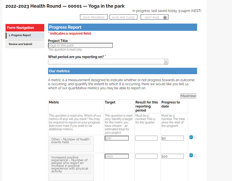 The Progress report form looks like this for the Grantee (note the Target comes across from the application) but the other columns are empty in the first progress report.