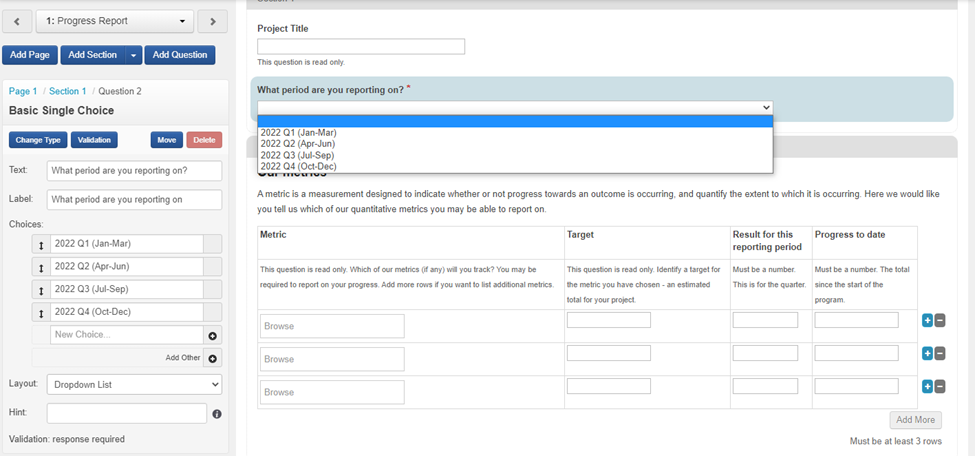 3. Change ‘Progress’ to ‘Progress to date’ and add a “Result for this reporting period” question into the Standard Section. (Why? This helps grantees distinguish between data for the quarter and cumulative data which is what we want in the “progress to date” standard field).