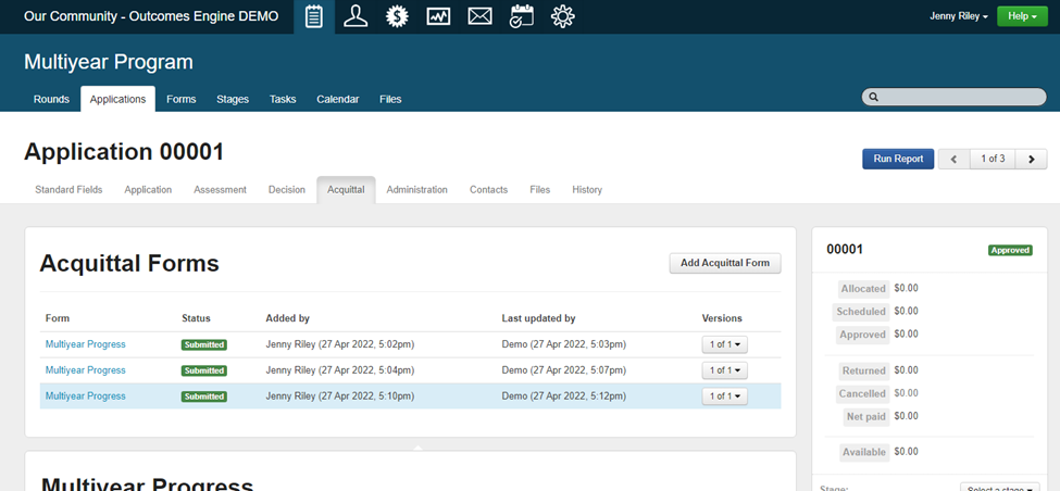 3. Use this ‘Progress Report’ as your standard, that is use it repeatedly. To do this append the same report multiple times to the acquittal tab.